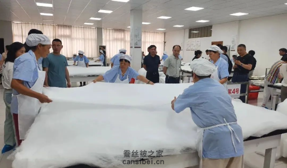 考察团首先来到浙江銀桑絲綢家紡有限公司。该公司作为当地的知名企业,以其优质的蚕丝被产品赢得了市场的广泛认可。在参观过程中,考察团成员详细了解了企业的生产流程、质量控制以及市场销售等方面的情况,并与企业负责人进行了深入的交流。